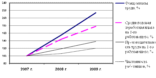 Рисунок 2.2. - Динамика ФОТ, ПТ, Ч и среднегодовой ЗП С 2007 года выработка продукции на одного работающего постоянно возрастала и по отчету за 2009 год составила 219,0 тыс. руб. Сравнивая темпы роста среднегодовой заработной платы и производительности труда на одного работающего за три года, наблюдается опережение темпов роста заработной платы (178%) по сравнению с темпами роста производительности труда (138%). Такая же тенденция наблюдается и в смежных годах (т.е. 2008 и 2009гг.). На рис. 2.2. представлена динамика показателей: - фонда оплаты труда; - численности работающих; - среднегодовой заработной платы на 1-го работающего; - производительности труда одного работающего в стоимостном выражении. Анализируя вышеперечисленные показатели отметим тенденцию роста их величины. Фонд оплаты труда увеличился с 6351 тыс. руб. в 2007 г. до 13566 тыс. руб.; т.е. вырос в 2,1 раза, прирост среднесписочной численности работающих составил 68 человек или 120% к базисному году. Значительное увеличение фонда оплаты труда и относительное уменьшение численности работающих привело к росту среднегодовой заработной платы с 18,5 руб. в 2007 г. до 32,9 руб. За рассматриваемый период заработная плата работающих увеличилась в 1,8 раза. На рис. 2.3 представлена динамика показателей выручки от реализации, себестоимости продукции и прибыли от реализации за 2007-2009 гг. Так за этот период себестоимость реализованной продукции выросла с 44986 тыс. руб. до 83009 тыс. руб.; прибыль от реализации увеличились с 30008 тыс. руб. до 37885 тыс. руб. Их увеличение связано с ростом выручки от реализации с 54998 тыс. руб. до 90235 тыс. руб.