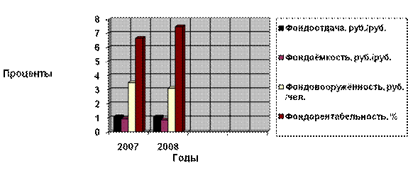 Рисунок 2.6 – График фондоотдачи, фондоёмкости, фондовооружённости и фондорентабельности за 2007-2008 годы Таблица 2.5– Анализ фондоотдачи, фондорентабельности, фондоёмкости и фондовооружённости за 2008-2009 гг.
