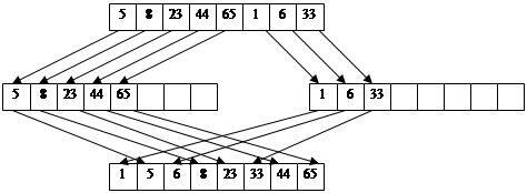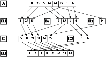 Рис. 2. Другий крок Очевидно, що число читань/перезаписів файлів при використанні цього методу буде не гірше, ніж при застосуванні методу прямого злиття, а в середньому - краще. З іншого боку, збільшується число порівнянь за рахунок тих, які потрібні для розпізнавання кінців серій. Крім того, оскільки довжина серій може бути довільної, то максимальний розмір файлів B і C може бути близький до розміру файлу A. Реалізація методу мові програмування Turbo Pascal. Нехай маємо типізований файл додатних цілочисельних даних, використовуючи метод злиття впорядкованих серій (природне злиття) відсортувати цей файл по зростанню. Примітка: Для генерування початкового файлу тут і надалі в курсовій програмі використовується файл Generat.pas, що формує бінарні файли. Лістінг даної програми поданий в додатках. Program Natural_sort; type Item=record key:longint; end; TFile=file of Item; var f0:TFile; procedure merge(k:integer;var f1,f2,g1,g2:TFile); var outSwitch:boolean; Winner:integer; Used:array[1..2] of integer; Fin:array[1..2]of boolean; current:array[1..2]of Item; procedure GetItem(i:integer); begin if(Used[i]=k)or((i=1)and eof(f1))or((i=2)and eof(f2)) then Fin[i]:=True else if i=1 then read(f1,Current[1]) else read(f2,Current[2]); Used[i]:=Used[i]+1; end; begin OutSwitch:=true; rewrite(g1);rewrite(g2); reset(f1);reset(f2); while (not eof(f1)) or (not eof(f2)) do begin Used[1]:=0;Used[2]:=0; Fin[1]:=false;Fin[2]:=false; GetItem(1);GetItem(2); while (not Fin[1])or(not Fin[2]) do begin if Fin[1] then Winner:=2 else if Fin[2] then Winner:=1 else if Current[1].key<Current[2].key then Winner:=1 else Winner:=2; if OutSwitch then write(g1,Current[Winner]) else write(g2,Current[Winner]); GetItem(Winner); end; OutSwitch:=not OutSwitch; end; close(g1);close(g2); close(f1);close(f2); end; procedure MergeSort(var f0:TFile); var f1,f2,g1,g2:TFile; i,n,k:integer;buf:Item; flag:boolean; begin Assign(f1,'F1Merge.itm'); Assign(f2, 'F2Merge.itm'); Assign(g1, 'G1Merge.itm'); Assign(g2,'G2Merge.itm'); rewrite(f1);rewrite(f2); rewrite(g1);rewrite(g2); reset(f0); n:=0; while not eof(f0) do begin read(f0,buf); write(f1,buf); inc(n); if not eof(f0) then begin read(f0,buf); write(f2,buf); inc(n); end; end; flag:=true;k:=1; Close(f1);Close(f2);Close(f0); n:=trunc(ln(n)/ln(2))+1; for i:=1 to n do begin if flag then merge(k,f1,f2,g1,g2) else merge(k,g1,g2,f1,f2); flag:= not flag; k:=k*2; end; rewrite(f0);reset(g1);reset(f1); if not flag then while not eof(g1) do begin read(g1,buf); write(f0,buf); end else while not eof(f1) do begin read(f1,buf); write(f0,buf); end; Close(f0);Close(g1);Close(f1); {erase(f1);erase(g1);erase(f2);erase(g2);} end; begin assign(f0,'a-file.bin'); MergeSort(f0); end. 3. Метод злиття впорядкованих серій В основі методу зовнішнього сортування багатошляхового злиття (злитя впорядкованих серій) лежить розподіл серій вихідного файлу по m допоміжних файлах B1, B2,..., Bm і їхнє злиття в m допоміжних файлів C1, C2,..., Cm. На наступному кроці виробляється злиття файлів C1, C2,..., Cm у файли B1, B2,..., Bm і т.д., поки в B1 або C1 не утвориться одна серія. Графічно це можна зобразити наступним чином: