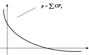 Смысл расчета этого коэффициента при анализе эффективности планируемых инвестиций заключается в следующем: IRR показывает максимально допустимый относительный уровень расходов, которые могут быть ассоциированы с данным проектом. Например, если проект полностью финансируется за счет ссуды коммерческого банка, то значение IRR показывает верхнюю границу допустимого уровня банковской процентной ставки, превышение которого делает проект убыточным. При NPV = 0 современная стоимость проекта (PV) равна по абсолютной величине первоначальным инвестициям I0 , следовательно, они окупаются. В общем случае чем выше величина IRR, тем больше эффективность инвестиций. Величину IRRсравнивают с заданной нормой дисконта r. При этом если IRR>r, то проект обеспечивает положительную NPV и доходность, равную IRR-r. Если IRR<r, затраты превышают доходы, и проект будет убыточным. Для оценки внутренней нормы окупаемости можно использовать график чистой дисконтированной стоимости, отметив одну отрицательную и одну положительную точку и соединив их линией. Для проекта, у которого отток (инвестиция) сменяется притоками, в сумме превосходящими этот отток, функция y = f(r) является убывающей, т.е. с ростом r график функции стремится к оси абсцисс и пересекает ее в некоторой точке, являющейся IRR. (Функция может иметь несколько точек пересечения с осью X). Пересечение с осью Х (NPV=0) даст приблизительную (а не точную) оценку внутренней нормы окупаемости. Ось ординат (r=0) график NPV пересекает в точке, равной сумме всех элементов недисконтированного денежного потока, включая величину исходных инвестиций. Важным моментом является то, что критерий IRR не обладает свойством аддитивности.