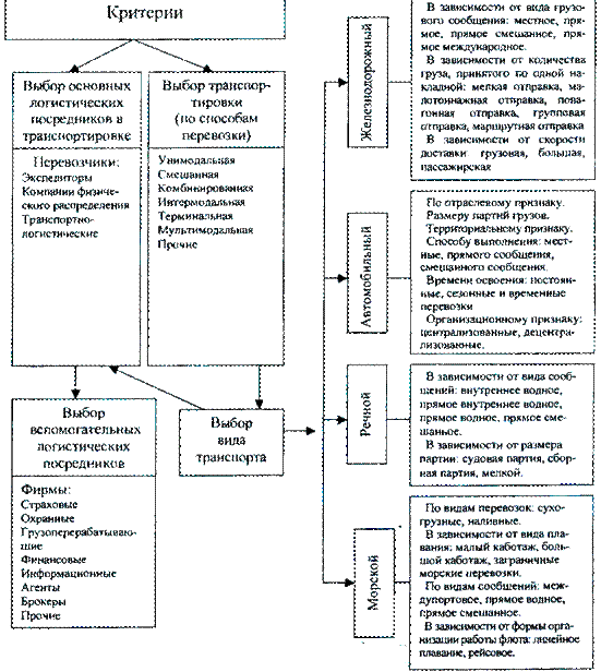 Рис. 4.2. Логистические процедуры выбора при организации транспортировки Унимодальная (одновидовая) транспортировка осуществляется одним видом транспорта, например автомобильным. Обычно применяется, когда заданы начальный и конечный пункты транспортировки логистической цепи без промежуточных операций складирования и грузопереработки. Критериями выбора вида транспорта в такой перевозке обычно являются вид груза, объем отправки, время доставки груза потребителю, затраты на перевозки. Так, при крупнотоннажных отправках и наличии подъездных путей в конечном пункте доставки целесообразнее применять железнодорожный транспорт, при мелкопартионных Смешанная перевозка грузов (смешанная раздельная перевозка) осуществляется обычно двумя видами транспорта, например: железнодорожно-автомобильная, речная-автомобильная, морская-железнодорожная и т. п. При этом груз доставляется первым видом транспорта в так называемый пункт перевалки или грузовой терминал без хранения или с кратковременным хранением с последующей перегрузкой на другой вид транспорта. Типичным примером смешанной перевозки является обслуживание автотранспортными фирмами железнодорожных станций или морского (речного) порта транспортного узла. Признаками смешанной раздельной перевозки является наличие нескольких транспортных документов, отсутствие единой тарифной ставки фрахта, последовательная схема взаимодействия участников транспортного процесса. При прямой смешанной перевозке грузовладелец заключает договор с первым перевозчиком, действующим - как от своего имени, так и от имени следующего перевозчика, представляющего другой вид транспорта. В силу этого грузовладелец фактически находится в договорных отношениях с обоими, причем каждый из них производит расчеты с грузовладельцем и несет материальную ответственность за сохранность груза только на соответствующем участке маршрута. Комбинированная перевозка отличается от смешанной наличием более двух видов транспорта. Использование смешанных (комбинированных) видов транспортировки часто обусловлено в логистической системе. Например, отправка крупных партий готовой продукции с завода-изготовителя на оптовую базу производится железнодорожным транспортом (с целью максимального снижения затрат), а развозка с оптовой базы в пункты потребления осуществляется автомобильным транспортом. При интермодальной перевозке грузовладелец заключает договор на весь путь следования с одним лицом (оператором). Оператором может быть, например, экспедиторская фирма, которая, пользуясь на всем протяжении маршрута перевозки груза различными видами транспорта, освобождает грузовладельца от необходимости вступать в договорные отношения с другими транспортными предприятиями. В мультимодальных перевозках один из видов транспорта выступает в роли перевозчика, а взаимодействующие виды транспорта - как клиенты, оплачивающие его услуги. Признаками интермодальной (мультимодальной) перевозки являются: наличие оператора доставки от начального до конечного пункта логистической цепи (канала); единая сквозная ставка фрахта; единый транспортный документ; единая ответственность за груз и исполнение договора перевозки. Основными принципами функционирования интермодальных и мультимодальных систем перевоз