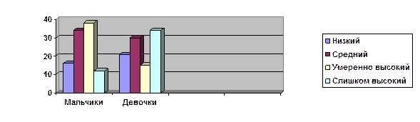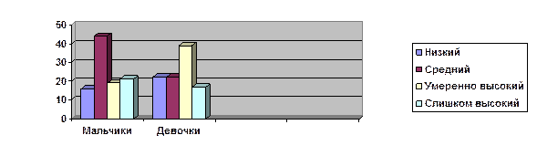 Рис.2. Сравнительный анализ результатов диагностики мотивации к избеганию неудач у мальчиков и девочек ( N=24) Как видно низкий и слишком высокий уровни мотивации к избеганию неудачи имеют незначительные различия. Показатели среднего уровня мотивации к избеганию неудач у девочек значительно ниже, чем у мальчиков. А показатели умеренно высокого уровня мотивации к избеганию неудачи гораздо выше, чем у мальчиков. Констатирующие факты говорят о том, что у девочек в большей степени преобладает мотив избегания неудач. Они ищут информацию о возможности неудачи при достижении результата, берутся за решение как очень легких задач (где им гарантирован 100% успех), так и очень трудных (где неудача не воспринимается как личный неуспех), готовы взять на себя ответственность, проявляют большую настойчивость при стремлении к цели. Результаты диагностики и сравнительный анализ готовности к риску Шуберта представлены в таблице 3 и на рисунке 3. Таблица 3 Результаты диагностики степени готовности к риску Шуберта N=24