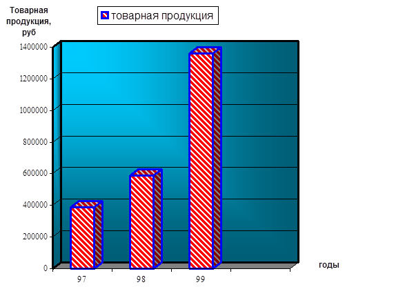 2.2. Анализ результатов производственной деятельности. Анализ результатов производственной деятельности начнем с изучения динамики валовой и товарной продукции, расчета базисных и цепных темпов роста и прироста по формуле (1.2.1) в п.1.2. По результатам произведенных расчетов (см. приложение № 7) среднегодовой темп прироста составит 36%. Объем производства товарной продукции увеличился на 241,3%. Таблица 2.2.1 Динамика товарной продукции
