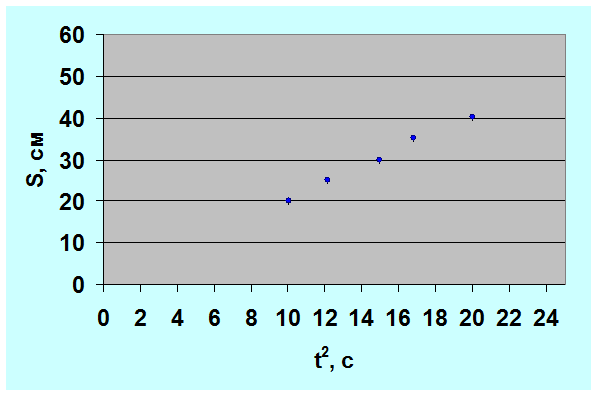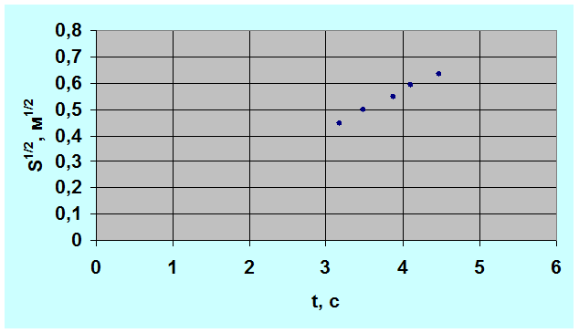 Средние значения времени <t > и квадрата времени < t 2 > прохождения пути S, приведенные в таблице 4.1, рассчитаны по выражениям 3.1 и 3.2 (число точек измерения n=5 ). Для определения случайной погрешности измерения, предварительно определим стандартную погрешность измерения, по формуле (3.4) Для первой точки измерения (S 1 = 40,1 см): Δt1 = t1 −< t>1 = 4,377-4,469= -0,092 с; Δt1 2 = (-0,092)2 = 0,008464с2 , Δt2 = t2 −< t>1 = 4,608 -4,469= 0,139 с; Δt2 2 = (0,139)2 = 0,019321с2 , Δt3 = t3 −< t>1 = 4,536-4,469= 0,067 с; Δt3 2 = (0,067)2 = 0,004489с2 , Δt4 = t4 −< t>1 = 4,589-4,469= 0,12 с; Δt4 2 = (0,12)2 = 0,0144 с2 ,