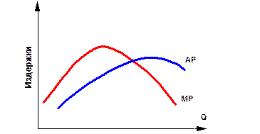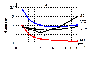 Рис. 3. Взаимосвязь между производительностью и издержкамиИз рис.3 видно, что между динамикой изменения предельного продукта (предельной производительности) и предельных издержек (равно как и среднего продукта и средних переменных издержек) существует обратная связь. До тех пор пока предельный (средний) продукт будет расти, предельные (средние переменные) издержки будут снижаться и наоборот. В точках максимального значения предельного и среднего продуктов величина предельных MC и средних переменных AVC издержек будет минимальной. Рассмотрим взаимосвязь общих TC, средних AVC и предельных MC издержек. Для этого дополним рис.2 кривой предельных издержек и совместим его с рис.1 в одной плоскости (рис.4). Анализ конфигурации кривых позволяет сделать следующие выводы о том, что: 1) в точке а , где кривая предельных издержек достигает своего минимума, кривая общих издержек TC из состояния выпуклости переходит в состояние вогнутости. Это означает, что после точки а при одних и тех же приращениях общего продукта величина изменений общих издержек будет возрастать; 2) кривая предельных издержек пересекает кривые средних общих и средних переменных издержек в точках их минимальных значений. Если предельные издержки меньше, чем средние общие издержки, последние уменьшаются (в расчёте на единицу продукции). Значит на рис.4а средние общие издержки будут падать до тех пор, пока кривая предельных издержек проходит ниже кривой средних общих издержек. Средние общие издержки будут расти там, где кривая предельных издержек проходит выше кривой средних общих издержек. То же можно сказать и по отношению к кривым предельных и средних переменных издержек MC и AVC. Что же касается кривой средних постоянных издержек AFC, то здесь такой зависимости нет, ибо кривые предельных и средних постоянных издержек не связаны друг с другом; 3) первоначально предельные издержки ниже как средних общих, так и средних издержек. Однако вследствие действия закона убывающей отдачи они превышают как те, так и другие по мере увеличения выпуска продукции. Становится очевидным, что дальше расширять производство, увеличивая только затраты труда, экономически невыгодно.