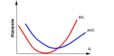 Рис. 2. Кривые средних издержек фирмы в краткосрочном периоде. Средние переменные издержки AVC - рассчитываются путём деления суммарных переменных издержек на соответствующее количество произведенной продукции, т.е. AVC = TVC/Q. Из рис.2 видно, что средние переменные издержки сначала снижаются, а затем растут. Здесь также сказывается действие закона убывающей отдачи. Средние общие издержки ATC - рассчитываются по формуле ATC = TC/Q. На рис.2 кривая средних общих издержек получена путём сложения по вертикали величин средних постоянных AFC и средних переменных издержек AVC. Кривые ATC и AVC имеют U-образную конфигурацию. Обе кривые в силу закона убывающей отдачи загибаются вверх при достаточно высоких объёмах производства. При увеличении числа занятых работников, когда постоянные факторы неизменны, производительность труда начинает падать, вызывая соответственно рост средних издержек. Для понимания поведения фирмы очень важна категория переменных издержек. Предельные издержки MC - это дополнительные издержки, связанные с производством каждой последующей единицы продукции. Поэтому MC можно найти путём вычитания двух рядом стоящих величин валовых издержек. Их также можно рассчитать по формуле MC = DTC/DQ, где DQ = 1. Если постоянные издержки не меняются, то предельные - это всегда предельные переменные издержки. Предельные издержки показывают изменения в издержках, связанные с уменьшением или увеличением объёма производства Q. Поэтому сравнение MC с предельной выручкой (выручкой от реализации дополнительно произведённой единицы продукции) имеет весьма важное значение для определения поведения фирмы в рыночных условиях.