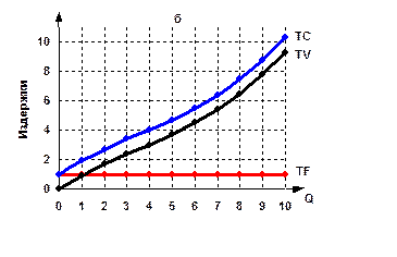 Рис. 1. Постоянные, переменные и общие издержки. Переменные издержки TVC - это издержки, величина которых изменяется в зависимости от изменения объёма производства. К ним относят затраты на оплату труда, приобретение сырья, топлива, вспомогательных материалов, оплата транспортных услуг, соответствующие социальные отчисления и т.п. Из рис.1 видно, что переменные издержки увеличиваются по мере роста выпуска продукции. Однако здесь прослеживается одна закономерность: вначале рост переменных издержек в расчёте на единицу прироста продукции идёт замедленными темпами (до четвёртой единицы продукции по графику рис.1), затем они растут всё возрастающими темпами. Здесь начинает сказываться закон убывающей отдачи. Сумма постоянных и переменных издержек при каждом данном объёме производства образует общие издержки TC. Из графика видно, что для получения кривой общих издержек сумму постоянных издержек TFC необходимо прибавить к сумме переменных издержек TVC (рис.1). Для предпринимателя представляет интерес не только общая сумма издержек производимых им товаров или услуг, но и средние издержки , т.е. издержки фирмы на единицу производимой продукции. При определении прибыльности или убыточности производства средние издержки сравниваются с ценой. Средние издержки подразделяются на средние постоянные, средние переменные и средние общие. Средние постоянные издержки AFC - рассчитываются путём деления общих постоянных издержек на количество произведенной продукции, т.е. AFC = TFC/Q. Так как величина постоянных издержек не зависит от объёма производства, то конфигурация кривой AFC имеет плавный нисходящий характер и свидетельствует о том, что с ростом объёма производства сумма постоянных издержек приходится на всё возрастающее количество единиц производимой продукции.