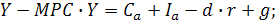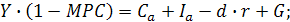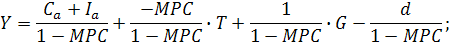 где r – ставка процента, d – коэффициент, показывающий чувствительность изменения объёма инвестиций к изменениям r . Объём государственных закупок он считал постоянной величиной. Отталкиваясь от этих уравнений, он преобразовал основное макроэкономическое тождество и решает его относительно Y .