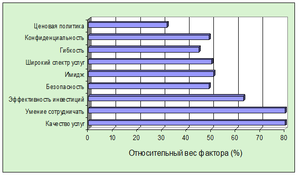 Рис. 2. Вес факторов, которые влияют на качество банковского обслуживания. Наиболее важные показатели качества присущие конкурентоспособному банку: 1) Банк является надежным и заслуживает доверия 2) Быстрое обслуживание 3) Персонал банка компетентен 4) Банк берет низкую оплату за услуги 5) Удобной график работы и осуществления платежей 6) Сохранение банковской тайны 7) Банк предлагает приемлемые процентные ставки 8) Банк предлагает широкий выбор услуг 9) Персонал банка особо приветлив 10) Банк расположен вблизи места, где Вы проживаете 11) Банк имеет много отделений / филиалов 12) Банк является украинским 13) Банк имеет уважаемых клиентов или акционеров 14) Большое количество клиентов 15) Банк имеет много банкоматов 16) Банк расположен вблизи места где Вы работаете 17) Банк является иностранным Первый уровень модели составляет разницу между ожиданиями клиентов и представлением об этих ожиданиях менеджеров банковского учреждения. Главными факторами, что влияют на этот уровень, являются: