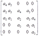 где n ─ порядок характеристического уравнения. Для n > 2 это условие является необходимым, но не достаточным. В этом случае из коэффициентов характеристического уравнения необходимо составить матрицу Гурвица, из матрицы составить определители и вычислить. Если все n определителей, составленных из матрицы Гурвица. положительны при положительном значении коэффициента Если хотя бы один из определителей отрицательный – система не устойчива. Система находится на границе устойчивости, если n-й определитель равен нулю. Достоинством метода является его простота, недостатком – необходимость всякий раз при изменении параметров системы составлять матрицу и вычислять определители. Метод не позволяет также определить запасы устойчивости. Рассмотрим пример. Пусть n=5. Матрица составляется по следующему правилу. По главной диагонали записывают коэффициенты от