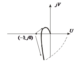 Рис.8. Годограф частотной передаточной функции неустойчивой системы Если К уменьшать, то годограф сжимается к оси ординат и система также становится неустойчивой (рис. 9). При этом