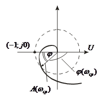 Рис.3.Годограф, дополненный дугой Запас устойчивости по фазе для хорошо демпфированных систем должен составлять Запас устойчивости по амплитуде В показывает во сколько раз необходимо увеличить усиление в системе, чтобы она оказалась на границе устойчивости: