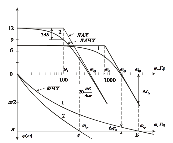 Рис. 5. Логарифмические характеристики разомкнутых систем: 1 – ЛЧХ устойчивой системы; 2 – ЛЧХ неустойчивой системы. Абсолютно и условно устойчивые системы Проанализируем АФХ разомкнутой системы (рис. 6), содержащей в своем составе апериодические и интегрирующие звенья. АФХ соответствует передаточной функции: