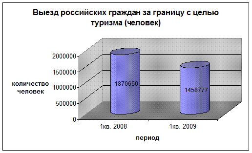 Таким образом, половина всех выездов российских туристов приходится на три страны: Китай, Турцию и Египет. Но начиная с середины 2008 года ситуация начала изменяться: мировой финансовый кризис затронул и российский туристский рынок. Насколько благоприятно или отрицательно скажется кризис на туристическом рынке России пока трудно сказать, но некоторые итоги уже можно подвести. Как известно, в период кризиса люди предпочитают ездить по своей стране или в соседние государства, поэтому в первую очередь кризис должен был сказался на количестве наших сограждан, предпочитающих отдыхать за рубежом (выездной туризм). Так оно и произошло. Правда стоит отметить, что количество наших туристов, отдохнувших за границей в 2008, все-таки выросло с 9,4 млн. чел до 11,3 млн. Однако этот рост аналитики связывают с тем, что основная масса населения страны ощутила последствия кризиса лишь в сентябре 2008 года, успев при этом уже отдохнуть. А вот с сентября туристский рынок России во всю ощутил последствия кризиса. По данным Ростуризма, спрос на туристические услуги в России за зимние месяцы 2008–2009 годов снизился на 22%. (Рисунок 2)