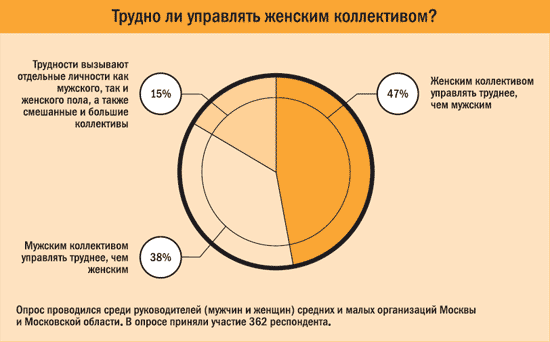 Більшість керівників-чоловіків (80 відсотків), відповідаючи на запитання про те, чи важко керувати жіночою командою, говорили, що особливих проблем немає. Однак, у ході інтерв'ю вони визнавали, що в жіночому колективі їх засмучує повільність у прийнятті рішень, бурхлива реакція дам на тон голосу і інтонацію, сильний вплив їх проблем в особистому житті на трудову діяльність, непередбачене фокусування уваги від робочих тем до сімейних питань, інтриг , істерик, шантажу. Також дратувало те, що вони не говорять прямо: починають здалеку, попутно даючи оцінку всьому що тільки можна, спотворюючи факти. До кінця розповіді забуваєш, про що взагалі була розмова. А ще ображаються, навіть плачуть, переходять на особисті взаємини і без згоди керівництва «облаштовують побут»: квіти, картини, статуетки та ін., пояснюючи свою непослідовність в «свідченнях», багато додавали: «Але ж це ж жінки! Вони такі від природи, нічого не поробиш».