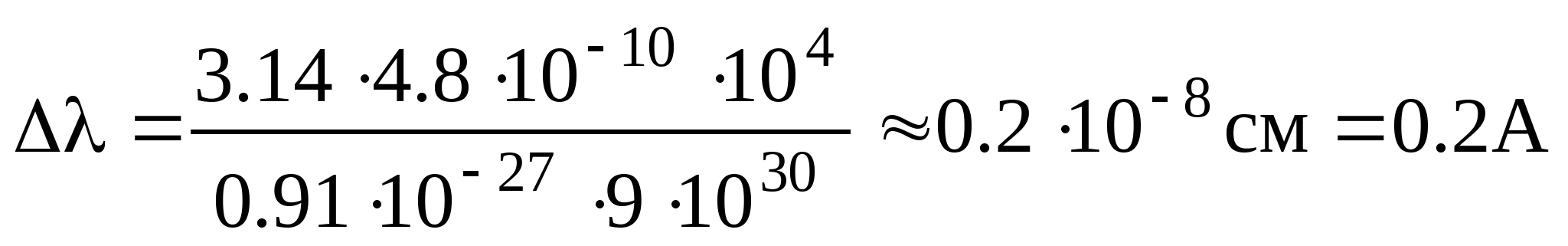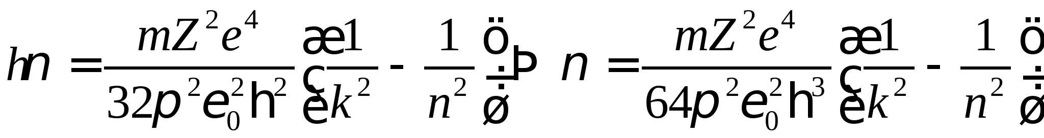 Рис.2 С учетом тонкой структуры схема термов выглядит более сложно, о чем дают представление схемы уровней натрия (рис. 1) и цезия (рис. 2). Поскольку мультиплетное расщепление термов в и F для натрия очень мало, подуровни в и F, отличающиеся значениями /, изображены на схеме слитно. Мультиплетное расщепление у цезия значительно больше, чем у натрия. На схеме цезия видно, что тонкая структура диффузной серии состоит не из двух линий, а из трех: Возникновение этих линий пояснено дополнительно на рис. 206, Изображенный пунктиром переход В нижней части схемы на рис. 3 показано, как выглядит сам мультиплет. Толщина линий на, схеме примерно соответствует" интенсивности спектральных линий. Совокупность получающихся линий выглядит как дублет, у которого одна из компонент в свою очередь оказывается двойной. Такая группа линий называется не триплетом, а сложным дублетом, так как она возникает в результате комбинации дублетных термов. З Рис. 3 аметим в заключение, что в связи с существованием спина электрона естественно возникает вопрос о том, что и у водородного атома уровни с l> 0 должны быть двойными, а спектральные линии — дублетными. Тонкая структура водородного спектра действительно была обнаружена экспериментально.Атом водорода В атоме водорода или водородоподобном ионе потенциальная энергия электрона равна Уравнение Шредингера имеет в этом случае вид Поскольку поле является центрально-симметричным, удобно воспользоваться сферической системой координат: r, Можно показать, что уравнение (2) имеет требуемые (т. е. однозначные, конечные и непрерывные) решения в следующих случаях: 1) при любых положительных значениях Е; 2) при дискретных отрицательных значениях энергии, равных Случай Е > 0 соответствует электрону, пролетающему вблизи ядра и удаляющемуся вновь на бесконечность. Случай Е < 0 соответствует электрону, находящемуся в пределах атома. Сравнение (3) с (5) показывает, что квантовая механика приводит к таким же значениям энергии водородного атома, какие получались и в теории Бора. Однако в квантовой механике эти значения полу- чаются логическим путем из основного предположения о том, что движение микрочастиц описывается уравнением Шредингера. Бору же для получения такого результата пришлось вводить специальные дополнительные предположения. Собственные функции уравнения (2) содержат три целочисленных параметра. Один из них совпадает с номером уровня энергии п, два других принято обозначать буквами l и т. Эти числа называются квантовыми: п — главное квантовое число, l — азимутальное квантовое число, т — магнитное квантовое число. При данном п числа l и т могут принимать следую» щие значения: L = 0, 1, 2, …, п -1, т. е. всего п различных значений; т=-l, -l+1, .... -1, 0, +1, .... l-1, l, т. е. всего 2l + 1 различных значений. Таким образом, каждому Еп (кроме Е1) соответствует несколько волновых функций Состояния с одинаковой энергией называются вырожденными, а число различных состояний с каким-либо значением энергии называется кратностью вырождения соответствующего энергетического уровня. Кратность вырождения уровней водорода легко вычислить, исходя из возможных значений для l и т. Каждому из п значений квантового числа l соответствует 2l + 1 значений квантового числа т. Следовательно, число различных состоя- н Таким образом, каждый уровень энергии водородного атома 