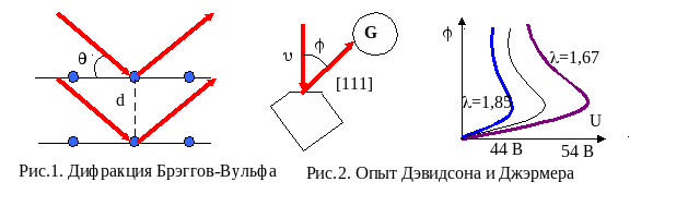 (3). Предполагалось, что дифракция электронных пучков будет аналогична дифракции рентгеновских лучей (рис.1) и условие дифракционных максимумов будет удовлетворять формуле Брэггов-Вульфа