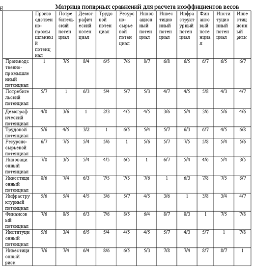 Для перевода качественной информации в числа в МАИ используется вербально-числовая шкала отношений, которая позволяет ставить в соответствие степеням предпочтения одного показателя над другим определенные числа. Попарные сравнения показателей качества ведутся в терминах доминирования одного показателя над другим - какой из них наиболее значим с точки зрения эксперта. Сравнивая две группы показателей по степени их влияния на уровень качества, эксперт в соответствии ставит целые числа от 1 до 9 или обратные значения этих чисел. В МАИ по соглашению сравнивается относительная важность левых элементов матрицы с элементами наверху. Интегральный коэффициент качества Кк изделия будет определяться по соотношению: где Рi - комплексный показатель качества i-той группы; Хi - коэффициент весомости i-той группы показателей качества. Для принятых групп показателей инвестиционной привлекательности региона по МАИ была определена матрица попарных сравнений (табл.1), а затем по формулам табл.1 были рассчитаны коэффициенты весомости групповых показателей (табл.2) и по формуле (1) значения самих показателей инвестиционной привлекательности (табл.3). Таблица 2 Матрица попарных сравнений для расчета коэффициентов весов