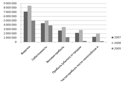 Таким образом, отмечаемые недостатки лежат не в плоскости конкретной линейной организационной структуры управления, а в плоскости организации работ компании, и могут быть устранены заменой части бюрократических элементов. Но это будет уже некоторая производная организационная структура. На верхнем уровне управления компанией ВГОК выделяет 14 функциональных областей: 1. Технический контроль 2. Учёт 3. Производство 4. Безопасность 5. Учет 6. Социальная сфера 7. Персонал 8. Снабжение 9. Сбыт 10. Финансы и экономика 11. Информационные технологии 12. Гражданская оборона и чрезвычайные ситуации 13. Управление делами 14. Документационное обеспечение 3. АНАЛИЗ ДИНАМИКИ ТЕХНИКО – ЭКОНОМИЧЕСКИХ ПОКАЗАТЕЛЕЙ ДЕЯТЕЛЬНОСТИ ОРГАНИЗАЦИИ. В таблице 7 на диаграмме 2 показано сравнение технико-экономических показателей предприятия 2007 - 2009 годов. Как видно из таблицы, многие показатели значительно изменились. Это во многом объясняется изменением экономической ситуации, как в стране в целом, так и в городе Нижний Тагил в частности. За 2008 год валюта баланса увеличилась на 1 337 050 тыс. руб. В течение отчётного периода Общество получило 1 978 123 тыс. руб. чистой прибыли, что выше показателя прошлого отчётного периода на 778 989 тыс. руб. (+64,96 %) В течение 2008 года показатели рентабельности Общества были положительными, деятельность предприятия была прибыльной. Результаты деятельности ВГОКа примерно соответствуют использованию возможностей, связанных с тенденциями отрасли в целом, а деятельность Общества оценивается удовлетворительно. Тенденции 2009 года значительно отличаются от 2008 года. Основной причиной этого стал экономический кризис, который значительно уменьшил общую выручку в 2009 на 40,9%. Также за этот период на предприятии снизилась заработная плата на 6% и упала производительность труда на 30,3%. Диаграмма 2 Сравнение техно-экономических показателей предприятия 2007, 2008 и 2009 годов.