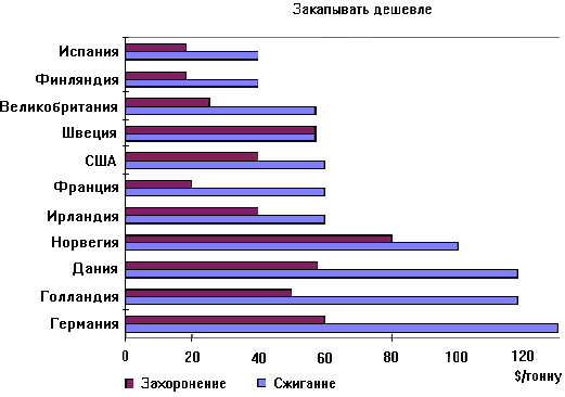 Мусоросжигание Мусоросжигание - это наиболее сложный и "высокотехнологичный" вариант обращения с отходами. Сжигание требует предварительной обработки ТБО. При разделении из ТБО стараются удалить крупные объекты, металлы (как магнитные, так и немагнитные) и дополнительно его измельчить. Для того чтобы уменьшить вредные выбросы из отходов, также извлекают батарейки и аккумуляторы, пластик, листья. Сжигание неразделенного потока отходов в настоящее время считается чрезвычайно опасным. Таким образом, мусоросжигание может быть только одним из компонентов комплексной программы утилизации. В настоящее время доля сжигания отходов в таких странах, как Австрия, Италия, Франция, Германия, колеблется от 20 до 40%: в Бельгии, Швеции -48-50: Японии - 70: Дании. Швейцарии - 80: Англии и США - 10%. В нашей стране сжиганию подвергается пока лишь около 2% бытового мусора (в Москве - около 10%)[6] . Сжигание позволяет примерно в 3 раза уменьшить вес отходов, устранить некоторые неприятные свойства: запах, выделение токсичных жидкостей, бактерий, привлекательность для птиц и грызунов, а также получить дополнительную энергию, которую можно использовать для получения электричества или отопления. Экологические воздействия мусоросжигательных заводов в основном связаны с загрязнением воздуха, в первую очередь - мелкодисперсной пылью, оксидами серы и азота, фуранами и диоксинами. Серьезные проблемы возникают также с захоронением золы от мусоросжигания, которая по весу составляет до 30% от исходного веса отходов и которая в силу своих физических и химических свойств не может быть захоронена на обычных свалках. Для безопасного захоронения золы применяются специальные хранилища с контролем и очисткой стоков. Говоря о социально-экономических аспектах мусоросжигания, следует отметить, что обычно строительство и эксплуатации мусоросжигательных заводов не по карману городскому бюджету и должно производиться в кредит либо частными компаниями. Во многих случаях компания, владеющая мусоросжигательным заводом, стремится подписать договор с городом, в котором будет предусмотрена обязательная поставка определенного количества и состава ТБО в сутки. Такие условия делают фактически невозможным осуществление программ вторичной переработки или компостирования или другие значительные изменения в методах утилизации. Поэтому строительство мусоросжигательных заводов требует очень тщательной координации с другими аспектами программы управления ТБО и к этому варианту надо обращаться только после того, как другие программы уже спланированы. Захоронение С традиционно применявшимися свалками обычно связано множество проблем - они являются рассадниками грызунов и птиц, загрязняют водоемы, самовозгораются, ветер может сдувать с них мусор и т.д. В 50-х годах впервые начинают внедряться так называемые "санитарные полигоны", на которых отходы каждый день пересыпаются почвой. Свалка или полигон по захоронению отходов представляет собой сложнейшую систему, подробное исследование которой началось только недавно. Дело в том, что большинство материалов, которые хоронят на полигонах, появились, как и сами современные полигоны, не более 20-30 лет назад. Никто не знает, за какое время они полностью разложатся. Когда ученые приступили к раскопке старых полигонов, они обнаружили у