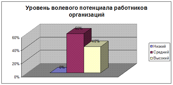 Диаграмма 1 – Уровень социальной креативности работников организации По результатам исследования видно, что все работники имеют уровень не ниже среднего. Высокий уровень социальной креативности преобладает у 10% у работников. Очень важно при внедрении инновационной деятельности иметь в организации большое количество сотрудников способных проявлять находчивость, предприимчивость, требовательность и настойчивость; людей, способных находить принципиально новые подходы в решении старых проблем, активно участвовать в создании новых, модифицированных или усовершенствованных систем услуг, ресурсов и возможностей, которые являются более справедливыми, обоснованными и чувствительными к запросам потребителей, и в устранении тех систем, которые не являются справедливыми. Отсюда видно, что в целом уровень социальной креативности необходимо повышать, чтобы постоянно совершенствоваться в профессии, расширяя базу профессиональных знаний и соблюдая стандарты и этические нормы социальной работы. Следующая диагностика волевого потенциала личности очень важна в исследовании, так как воля часто рассматривается как одна из центральных и наиболее информативных характеристик личности, которая выражается в умении преодолевать внутренние и внешние трудности при совершении целенаправленных действий и поступков. Воля позволяет целенаправленно организовать любую деятельность, в том числе и инновационную.