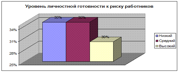 Диаграмма 3 – Уровень творческого потенциала работников Характер выраженности инновационных процессов, стремление к инновационной деятельности зависит от готовности человека рисковать, принимать решения в условиях неопределенности. Диагностика уровня личностной готовности к риску позволяет оценить степень готовности к риску. Риск понимается как действие на удачу в надежде на счастливый исход или как возможная опасность, как действие, совершаемое в условиях неопределенности.