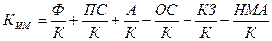 где ИМ – сумма иммобилизации; Ф – фонды банка; ПС – прирост стоимости имущества при переоценке; А – амортизация основных средств и НМА; ОС – основные средства по балансу, включая землю; КЗ – капитальные затраты (вложения); НМА – нематериальные активы. Для оценки качественного состава собственных средств определяют коэффициент иммобилизации: