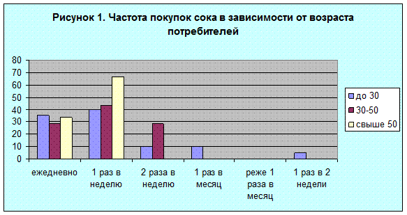 Предметом данного исследования является товар-сок различных производителей, видов, объёмов и качества. Объект Главным объектом исследования являются мнение различных категорий потребителей и их пожелания. Определение выборки: Аудитория потенциальных потребителей сока: -мужчины и женщины различного возраста -уровень дохода не брался во внимание Данное исследование проводилось в городе Краснодаре, в мае 2009 года. Было опрошено 30 человек разного возраста и пола. Каждому предлагалось заполнить анкету, состоящую из 8 вопросов с различными вариантами ответов. В анкету были включены вопросы, не содержавшие точных ответов для выбора, потребитель сам должен был ответить на них. В опросе приняли участие мужчины и женщины трех возрастных категорий: до 30 лет – 66,7% опрошенных, от 30 до 50 лет – 23,3% и старше 50 лет - 10%. По результатам анкетирования мы провели анализ предпочтения соков, обозначили основные критерии, которыми руководствуются потребители при покупке того или иного сока. Выводы по проведённому исследованию При анализе полученных данных были сделаны следующие выводы по различным критериям предпочтений потребителей. Все данные для большей наглядности представлены также в виде диаграмм. Большинство потребителей - 46,5% - покупают соки два раза в неделю. Примерно одинаковый процент краснодарцев приобретает их один раз в неделю и один раз в месяц - соответственно 15,5 и 13,5% опрошенных. Ежедневно эту продукцию покупают 11% респондентов. 1.Частота покупок сока в зависимости от возраста В зависимости от возраста потребителей наибольшее количество горожан, приобретающих соки, зафиксировано среди потребителей в возрасте до 30 лет (рис. 1).