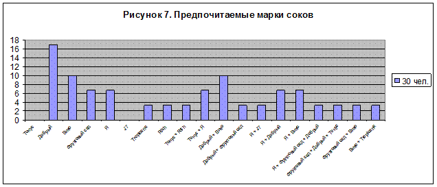 Добрый день. Я прошу Вас принять участие в маркетинговом исследовании желаний и предпочтений потребителей в выборе натурального сока. Для меня очень важно Ваше мнение. Анкета: 1. Пол: а) Ж б) М 2. Возраст: а) до 30 б) от 30-50 в) свыше 50 3. Сок, какой марки Вы предпочитаете: а) J7 б) Я в) Фруктовый сад г) Добрый д) Вико е) Тонус ж)_____________________ 4. Какую упаковку Вы выбираете при покупке: а) Tetra Pack стандартный 1 литр б) Tetra Pack 2 литра в) Пластиковая бутылка г) Стеклянная бутылка до 1-го литра д) Tetra Pack 0,25 литра е) Tetra Pack 1,5 литра ж) Стеклянная банка 3 литра з) Tetra Brick Square 1 литр