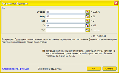 1. Вводим данные - Ставка=13,50% - по условию задачи - Норма=ставка/2=13,50%/2=6,75% - так как проценты начисляются каждые пол года - Кпер=33*2=66 - так как проценты начисляются каждые пол года - Бс=2012,07 - по условию задачи 2. Для получения результата используем функцию ПС. - Выделяем ячейку для ответа. На панели инструментов кликнем на "вставка функции". Выбираем функцию ПС. Видим активное окно.