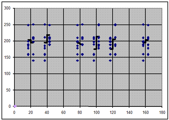 2.3 Проверка воспроизводимости эксперимента Проверка воспроизводимости эксперимента проводится аналогично ПФЭ. Рассчитанные для рассматриваемого примера значения Если вычисленное по данным эксперимента (эмпирическое) значение критерия G (G =0,2546)окажется меньше критического значения G кр , найденного по таблице для n1вос = m – 1 и n2вос = N и выбранного уровня значимости q вос = 0,05 (в данном случае Gкр =0,3894), то гипотеза об однородности выборочных дисперсий отвечает результатам наблюдений. В данном случае воспроизводимость эксперимента выполняется. 2.4 Построение диаграммы рассеяния Вид диаграммы рассеяния приведен на рисунке 1. Рисунок 1
