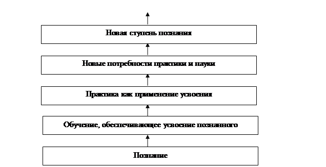 Обучение, как категория педагогической науки и процесс обучения, или, как его еще называют дидактический процесс, — понятия не тождественные, не синонимы. Процесс — это смена состояния системы обучения как целостного педагогического явления, как фрагмента, как акта педагогической деятельности. Осуществляясь на разных уровнях, процесс обучения носит цикличный характер, и важнейшим, главным показателем развития циклов учебного процесса являются ближайшие дидактические цели педагогического труда, которые группируются вокруг двух основных целей: образовательная — чтобы все учащиеся приобрели определенную сумму знаний, навыков и умений, развили свои духовные, физические и трудовые способности, приобрели зачатки трудовых и профессиональных навыков; воспитательная — чтобы воспитать каждого ученика высоконравственной, гармонически развитой личностью с научно-материалистическим мировоззрением, гуманистической направленностью, творчески активной и социально зрелой. Соотношение этих целей в условиях современной школы таково, что первая соподчинена второй. Следовательно, главная цель образования — вырастить человека честного, порядочного, умеющего работать самостоятельно, реализовать свой человеческий потенциал. Другими двумя показателями развития циклов учебного процесса выступают средства обучения и результативность обучения как целостной динамической (деятельностной) системы. Назвав эти показатели системы обучения, мы сразу наталкиваемся на целый ряд вопросов, а именно: что же это за система? какие функции она выполняет? из чего она состоит; из каких элементов? Ответы на эти вопросы дают нам возможность понять саму природу процесса обучения. 2. Познание и обучение в развитии общества В историческом развитии общества всегда выступают два процесса: познание окружающего мира - с одной стороны, и обучение подрастающих поколений с другой. На любой ступени развития общества оба процесса представляют непременное условие его существования. Каково соотношение между ними? На первый взгляд может показаться, что это различные, мало связанные между собой процессы. Задачи познания - открытие новых фактов и законов развития объективного мира. Задача обучения - вооружение людей теми знаниями и опытом, которых достигло познание. Между познанием и обучением имеются внутренние, глубокие связи; познание является первичным по отношению к обучению. Обучение имеет своим содержанием знания, которые представляют собой результат, продукт познания. Но это вторичное обусловлено объективно. Для того чтобы знание как результат познания могло быть использовано обществом, применено в жизни, оно должно быть усвоено членами общества, т. е. стать содержанием обучения. Только при этом условии возможно и дальнейшее развитие познания, науки. Даже при схематическом (см. рис. 1) рассмотрении выступают сложные связи между познанием и обучением. В действительности эти связи реализуются не непосредственно, а опосредованно как взаимосвязь движения наук о природе и обществе, с одной стороны, и процесса образования и обучения — с другой. Подобный взгляд на связь познания и обучения разделяется не всеми. Многие идеалисты не признают роль практики как источника познания. Познание рассматривается ими как произвольная деятельность человеческого 