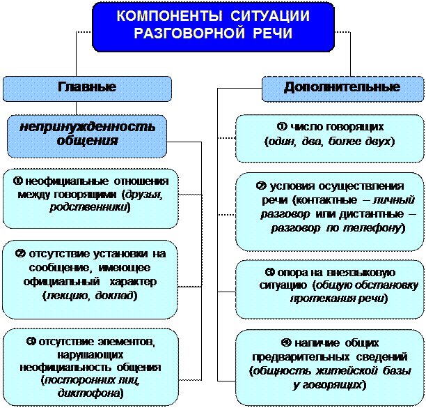 компонентам ситуации относятся: 1) неофициальные отношения между говорящими, т.е. близкие (дружеские, родственные) или нейтральные; 2) отсутствие у говорящих установки на сообщение, имеющее официальный характер (лекцию, доклад, выступление на собрании, ответ на экзамене, научный диспут и т.д.); 3) отсутствие элементов, нарушающих неофициальность общения (посторонних лиц, магнитофона для записи речи и т.п.). Именно этими компонентами создается непринужденность общения.