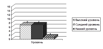Рис. 2.1.5 Уровень переживания страхов детьми Количественный анализ результатов исследования показывают, что у 2 из 15 детей уровень страхов значительно превышает возрастную норму, что свидетельствует о начале развития невроза страха. У 8 детей выше возрастной нормы, у 5 детей соответствует возрастной норме. Многие дети бояться темноты, уколов, отца и наказания родителей, а некоторые дети боятся обоих родителей. Следующим этапом диагностики стало проведение графической методики М.А. Панфиловой «Кактус» для выявления уровня эмоционального напряжения. Детям предлагалось нарисовать кактус таким, какой они себе его представляют. После рисования дети отвечали на 5 вопросов, касающихся этого кактуса. Критериями для выявления уровня эмоционального напряжения выступает наличие в рисунках признаков тревожности, агрессивности и демонстративности, неуверенности в себе. За каждый признак ребенок получает 1 балл. 4-3 балла – высокий уровень эмоционального напряжения, 2 балла – средний уровень, 1 – 0 балла – низкий уровень. Выявление признаков тревожности, агрессивности, демонстративности и неуверенности в себе предложены М.А. Понфиловой. Наличие агрессивности можно предположить, если в рисунке присутствуют иголки. О демонстративности говорит наличие выступающих отростков в кактусе, вычурность форм. Признаки тревоги выражаются в использовании темных цветов, преобладании внутренней штриховки прерывистыми линиями. О неуверенности в себе можно судить по маленькому размеру рисунка, расположению внизу листа. Также о признаках тревожности, агрессивности, демонстративности и неуверенности в себе можно судить по ответам детей о нарисованном кактусе. Данные представлены в протоколе №5 (Приложение 6) и зафиксированы в гистограмме (Рис.2.1.6)