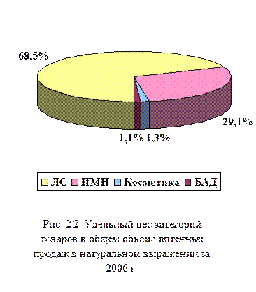 Обозначенные данные носят обобщенный характер и не содержат информации относительно количества врачебных форм и дозирование зарегистрированных препаратов, а также – информации относительно количества зарегистрированных в Украине иммунобиологических препаратов (около 2,6 тыс. позиций). На протяжении последних лет отслеживается положительная динамика увеличения количества препаратов, которые внедряются в производство предприятиями области. Так, на протяжении 2003 года в производство было внедрено 100 лечебных средств, 2004 – 120, 2005 – 158, за 8 месяцев текущего года внедрено более 100 новых препаратов. 2.2. Динамика розничных продаж на фармацевтическом рынке Украины Общий объем аптечных продаж в розничных ценах в 2006 г. составил 5,5 млрд. грн. (около 1 млрд. дол. США) в денежном выражении и 1.4 млрд. упаковок – в натуральном. Объем продаж ЛС в розничных ценах составил 4,8 млрд. грн. (около 900 млн. дол. США) в денежном выражении, что выше аналогичного показателя 2005 г. на 4,1%, и 986,6 млн. упаковок в натуральном выражении, что ниже аналогичного показателя 2005 г. на 0,2%: удельный вес ЛС в общем объеме розничных продаж – 87% в денежном выражении (рис. 2.1) и 68,5% – в натуральном выражении (рис. 2.2.), причем по сравнению с 2005 г. удельный вес продаж ЛС уменьшился на 0,6 и 5,1% соответственно, то есть в аптечных учреждениях растет потребление товаров тех категорий, которые не относятся к ЛС.