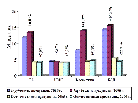 По всем категориям “аптечной корзины” в 2006 г. больше половины проданных упаковок составляла продукция отечественного производства (табл. 2.2). Для ЛС и БАД удельный вес продаж отечественных товаров наиболее высок – 73,1 и 76,7% соответственно. Однако для объема продаж в денежном выражении ситуация противоположна – только для БАД объемы продаж импортной и отечественной продукции распределились равномерно, по остальным категориям товаров удельный вес продаж импортной продукции намного выше такового отечественной Столь разительные отличия удельного веса по объему продаж а натуральном и денежном выражении неудивительны, если учесть разницу средневзвешенной розничной стоимости одной упаковки товаров отечественного и зарубежного производства. Средняя стоимость зарубежных препаратов выше таковой отечественных в 7 раз, БАД – в 3,4 раза, ИМН – в 1,9 раза. Более того, средневзвешенная стоимость препаратов зарубежного производства выше таковой украинских ЛС не только по абсолютным значениям, но и по величине прироста (рис. 2.3). Особенности ценовой политики, проводимой в течение 2005-2006 г.г. подробно описывались в специализированных фармацевтических изданиях Многие отечественные производители в 2005-2006 г.г. активизировали процесс создания для своей продукции дополнительной стоимости, и можно предположить, что в 2007 г. ситуация с денежными объемами розничного рынка может измениться в сторону увеличения удельного веса продаж отечественных препаратов. Время диктует свои условия, старая добрая стратегия украинского рынка – игра на понижение, конкуренция исключительно за счет цены, уходит в прошлое, сегодня потребитель уже ищет не самый дешевый, а оптимальный по соотношению цена/качество препарат, и, вероятнее всего, количество таких “цивилизованных” потребителей будет увеличиваться достаточно быстро. Если украинские производители соответствующим образом отреагируют на изменения в структуре потребления, тогда следует ожидать изменения структуры продаж отечественных ЛС в сторону увеличения удельного веса более дорогих препаратов с новыми характеристиками, что соответственно приведет к увеличению средневзвешенной стоимости одной упаковки.