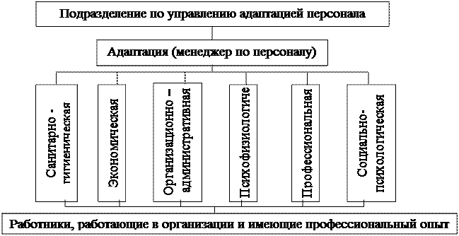 Рис. 2. Направления деятельности подразделения по управления адаптацией персонала В.Р.Веснин описывает функции непосредственного руководителя нового работника на всех этапах — от «введения в должность» до завершающих этапов адаптации. По его мнению, при индивидуальном введении в должность (которое, опять же, предпочтительнее группового, так как более эффективно и требует меньших затрат), непосредственный руководитель «поздравляет нового сотрудника с началом работы, представляет его коллективу (рассказывает биографию, особо отмечая достоинства), знакомит с подразделением и обстановкой в нем, подробно излагает требования, в том числе и неписаные, сообщает о трудностях, которые могут встретиться, и наиболее распространенных ошибках в работе, о будущих коллегах, особенно тех, у кого трудный характер, и тех, на которых всегда можно положиться, просить совета… Руководитель осуществляет инструктаж, контроль за первыми шагами новичка, выявляет сильные и слабые стороны его подготовки, определяет реальную потребность в дополнительном обучении, оказывает всестороннюю помощь в адаптации»[9] . В.Р.Веснин считает, что социально – психологическая адаптация руководителей сложна «прежде всего, из-за несоответствия уровня их и новых подчиненных. Если руководитель будет на голову выше коллектива, последний не сможет воспринимать его требований, и руководитель, в сущности, окажется в положении генерала без войска; в противном случае коллектив будет «стадом без пастуха». Процесс вхождения осложняется в том случае, если прежний начальник становится начальником более высокого уровня»[10] . Успешность адаптации зависит от характеристик производственной среды и самого работника. Чем сложнее среда, чем больше отличие ее от привычной среды на прежнем месте работы, чем больше связано с ней изменений, тем труднее проходит процесс адаптации. Адаптация как процесс характеризуется определенной продолжительностью, и следовательно, имеет свое начало и окончание. Если в отношении начала адаптации вопросов не возникает (это начало деятельности работника в новых условиях), то определить ее окончание весьма трудно. Дело в том, что адаптация — это процесс, протекающий постоянно в меру изменения факторов внешней среды трудовой деятельности работника, да и изменения самого человека. Поэтому адаптация имеет отношение и к человеку, который не менял рабочего места[11] . подход к оценке производственной адаптации исходит из характеристики и результатов каждой из ее сторон. Так, для характеристики психофизиологической адаптации, особенно на работах с большим физическим напряжением (например, для оценки степени тренированности, как одного из результатов адаптации) используются показатели выработки и энергозатрат, а также показатели состояния сердечнососудистой системы, функции кровообращения, дыхания, скорость восстановления и т.п. Профессиональную адаптацию, как полное и успешное овладение профессией, характеризуют такие показатели, как степень освоения норм времени (их выполнение, достижение среднего процента, сложившегося в коллективе), выход на средний уровень брака продукции по вине работника и др[12] . К показателям, характеризующим социально-психологическую адаптацию, относятся уровень психологической удовлетворенности новой для челове