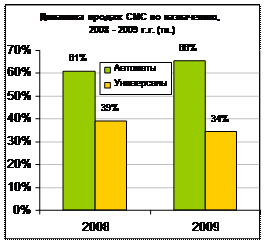 Рис.2.2.1. Продажи СМС по назначению, 2008-2009 гг. Такие оптимистические прогнозы дают повод участникам этого рынка продолжать расширять производство, разрабатывать новые формулы, предлагать потребителю новые виды продукции. Стратегическая направленность работы ОАО «Нэфис Косметикс» - максимально возможный рост доли предприятия на данном сегменте рынка бытовой химии посредством постоянного развития ассортимента, а также увеличения объемов производства и реализации своей продукции. Российский рынок жидких моющих средств для посуды (ЖМС) в настоящее время также имеет устойчивую тенденцию к росту. Согласно прогнозам к 2011 году емкость отечественного рынка составит 165 тыс. тонн. Объем продаж в 2009 г. составил 71,8 тыс. тн. (по данным «Nielsen»). Кроме того, предполагается, что объем импорта постепенно будет снижаться, а экспорт продолжит свой рост, за счет чего внутренние производители средств для мытья посуды смогут еще более нарастить свое производство. На рынке ЖМС для посуды присутствуют порядка 50 основных игроков, из них крупнейшие это «Procter&Gamble», ОАО «Нэфис Косметикс» и «Henkel». Крупные доли в совокупном объеме производства и продаж данной категории товаров занимают порядка 7 брендов, остальные представлены фактически штучно.