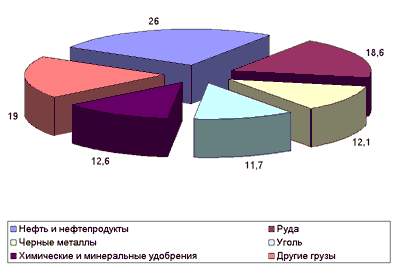 Рисунок 3.2. Структура транзитных грузов, переработанных морскими портами Украины в 1999 г., %