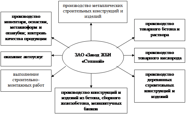 Рис.1- Виды деятельности ЗАО «Завод ЖБИ «Степной» Общество является юридическим лицом и имеет в собственности обособленное имущество, учитываемое на его самостоятельном балансе. Оно может от своего имени приобретать и осуществлять имущественные и личные неимущественные права, нести обязанности, быть истцом и ответчиком в суде. Вправе в установленном порядке открывать банковские счета на территории Российской Федерации и за ее пределами. Общество осуществляет все виды внешнеэкономической деятельности. Не отвечает по обязательствам своих акционеров. Государство и его органы не несут ответственности по обязательствам общества, равно как и общество не отвечает по обязательствам государства и его органов. Общество не имеет филиалов и представительств. Уставный капитал общества составляет 7 174 000 (Семь миллионов сто семьдесят четыре тысячи) рублей. Он разделен на 7174 (Семь тысяч сто семьдесят четыре) обыкновенные именные акции номинальной стоимостью 1000 (Одна тысяча) рублей каждая. Общество вправе размещать дополнительно к размещенным акциям обыкновенные именные акции в количестве 7000 (Семь тысяч) штук номинальной стоимостью 1000 (Одна тысяча) рублей каждая (объявленные акции). Объявленные акции предоставляют те же права, что и размещенные акции соответствующей категории (типа). Уставный капитал может быть увеличен путем увеличения номинальной стоимости акций или размещения дополнительных акций. Уставный капитал общества может быть уменьшен путем уменьшения номинальной стоимости акций или сокращения их общего количества, в том числе путем приобретения части акций. Все акции общества являются именными и выпускаются в бездокументарной форме. В обществе создается резервный фонд в размере 5 процентов от уставного капитала общества. Величина ежегодных отчислений в резервный фонд общества составляет 5 процентов oт чистой прибыли общества. Указанные отчисления производятся до достижения размера резервного фонда, предусмотренного уставом. Резервный фонд общества предназначен для покрытия его убытков, а также для выкупа акций общества в случае отсутствия иных средств. Резервный фонд не может быть использован для иных целей. Общество может быть реорганизовано добровольно в порядке, предусмотренном в Федеральным законом «Об акционерных обществах». Другие основания и порядок реорганизации общества определяются Гражданским кодексом Российской Федерации и иными федеральными законами Основной производственной деятельностью предприятия ЗАО «Завод ЖБИ «Степной» является производство и реализация товарного бетона и раствора, железобетона, бетоноблоков и т.д. Производственную структуру ЗАО «Завод ЖБИ «Степной» можно представить в следующем виде (рис. 2):
