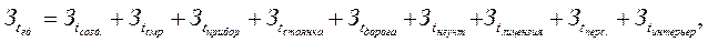 где Зt созд. – затраты на создание и регистрацию предприятия, Зt смр – затраты на проведение реконструкции и достройки здания кафе, Зt приобр. – затраты на приобретение оборудования, мебели, инвентаря для кафе, Зt стоянка – затраты на устройство стоянки, Зt дорога – затраты на ремонт пешеходной дороги, Зt неучт. – неучтённые единовременные затраты, Зt персонал – затраты по набору персонала кафе-столовой, включая первичный медосмотр, Зt лицензия – затраты на получение лицензии и разрешение соответствующих организаций, Зt интерьер – затраты по найму дизайнера и созданию интерьера. Суммарные ежегодные текущие издержки, связанные с осуществлением ИП за каждый год расчетного периода определяются по формуле: