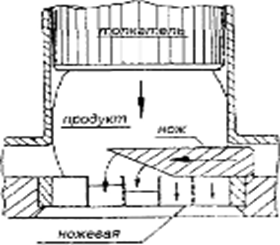 В овощерезках комбинированного действия продукт нарезается сначала вращающимся двухлопастным ножом на кругляши, а затем проталкивается этим же ножом через ножевую решетку, в результате чего происходит нарезка