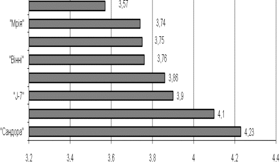 Рис. 4 – Середній бал для кожної торгової марки, представлених на споживчому ринку. Але варто сказати, що ринок не стоїть на місці, а весь час динамічно змінюється, і рейтинг перерахованих торгових марок може кардинально змінитись. На сьогодні самою стабільною залишається лише позиція лідера – компанії «Сандора» – завдяки великому відриву від інших претендентів.