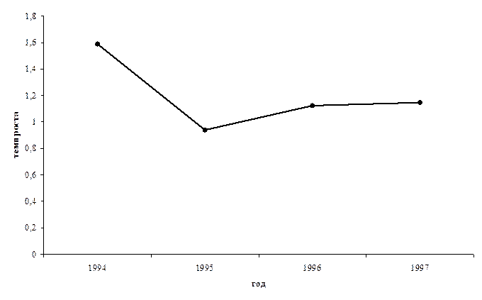 Вывод: По полученным результатам, мы можем сказать, что во 2-м периоде стоимостной объем продажи товаров по сравнению с 1-м периодом составил 294%, или увеличился на 194%. Так же полученный индекс физического объема показывает, что физический объем товарооборота в отчетном периоде (2-й период) уменьшился по сравнению с базисным периодом (1-й период) на 34.1%. Задача №7 Темпы роста товарооборота торгового предприятия в 1994 – 1998 г.г. составили (в % к предыдущему году)