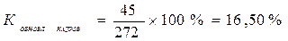 Отсюда находим коэффициент обновления кадров как отношение принятых за период сотрудников к среднесписочной численности, умноженное на 100 %. Получаем формулу: