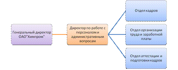 Высокое качество продукции позволяет продавать ее на зарубежных рынках. Экспорт составил 16,9% от общего объема продаж по итогам текущего года. 2.2 Анализ трудовых ресурсов предприятия. Формирование эффективной системы управления персоналом является одной из наиболее важных задач менеджмента предприятия. В структуре органов управления ОАО «Химпром» существует несколько отделов, непосредственно участвующих в системе управления персоналом на предприятии: отдел кадров, отдел аттестации и подготовки кадров, отдел организации труда и заработной платы (рис.1). В современных условиях одной из важнейших стратегических задач ОАО «Химпром» в области управления становится формирование ядра высококвалифицированного персонала, способного решать производственные задачи с меньшими затратами и наилучшим образом.