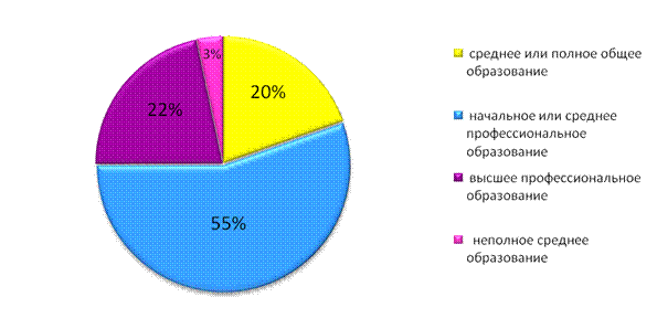 Рис.2. Возрастной состав персонала ОАО «Химпром» В ОАО «Химпром» по данным 2009 года преобладает возрастная группа от 35 до 55 лет. Следует отметить, что «Омоложение» персонала – немаловажный фактор, влияющий на совершенствование системы управления персоналом. Состав персона по уровню образования показан на рис. 3.