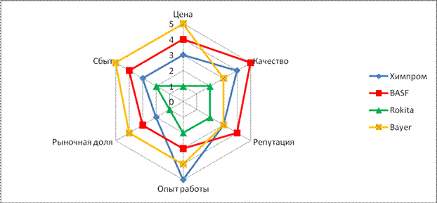 Исходя из SWОТ-анализа, можно сделать вывод, что накопленный многолетний опыт работы на рынке химической промышленности, высокое качество продукции, высокая эффективность производства, высокий спрос на химическую продукцию ОАО «Химпром» в России и устойчивая тенденция к его увеличению способствуют успешному функционированию ОАО «Химпром» как на отечественном, так и на зарубежном рынке. Однако такие отрицательные факторы, как высокий уровень износа, высокая себестоимость продукции, снижение инвестиций, необходимость совершенствования системы морального и материального стимулирования персонала могут во многом притормозить развитие предприятия. Следует более эффективно использовать сильные стороны для получения отдачи от возможностей (хорошая репутация позволяет более эффективно использовать Интернет-технологии для развития рекламы и налаживания связей с потребителями); использовать сильные стороны для устранения угроз (высокое качество продукции, многолетний опыт и хорошая репутация предприятия позволят победить конкурентов). Стоит обратить внимание на то, что такая комбинация, как угрозы (появление новых конкурентов) и слабые стороны (отсутствие рекламы, ориентированной на внешний рынок) может стать губительной для предприятия. 3.2. Многоугольник конкурентоспособности ОАО «Химпром». Конкурентоспособность предприятия - это его преимущество по отношению к другим предприятиям данной отрасли внутри страны и за ее пределами. Конкурентоспособность не является имманентным качеством фирмы, это означает, что конкурентоспособность фирмы может быть оценена только в рамках группы фирм, относящихся к одной отрасли, либо фирм, выпускающих аналогичные товары (услуги). Конкурентоспособность можно выявить только сравнением между собой этих фирм как в масштабе страны, так и в масштабе мирового рынка. Проанализируем положение ОАО «Химпром» на рынке по отношению к его основным конкурентам (табл.8, рис. 4). Таблица 8. Бальная оценка конкурентов ОАО «Химпром».