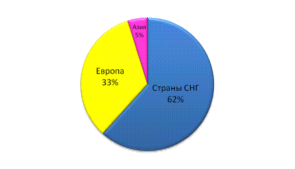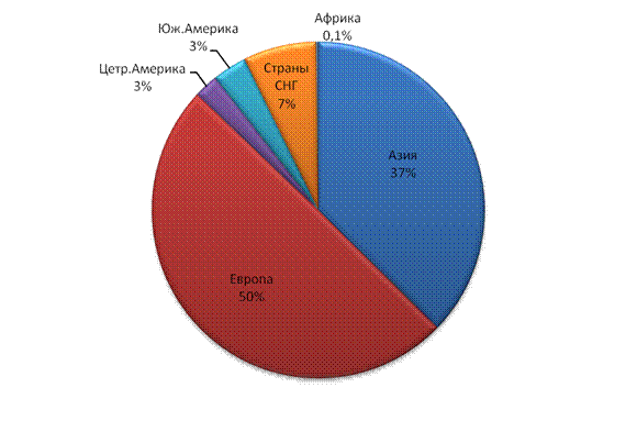 Рис.7. География экспорта ОАО «Химпром» в 2008 году. Анализируя географию экспорта предприятия, можно сделать вывод о том, что в 2008 году сократилась доля экспорта в Европу на 12% и увеличилась доля экспортных поставок в страны Азии на 6%, по сравнению с 2007 годом. ОАО «Химпром», следуя основным принципам своей экспортной программы, а также основным положениям федеральной программы по развитию, расширению и укреплению сотрудничества со странами СНГ, стремится к наращиванию таких связей. Результатом явилось то, что в 2008 году экспорт продукции в страны СНГ составил 11%, от общего объема экспорта. В качестве основных партнеров можно выделить компании Казахстана, Узбекистана, Украины, Туркменистана, Грузии, Армении. Таким образом, мы можем говорить о расширении объемов и географии отгружаемой продукции, а, следовательно, и о поступлении денежных средств. Что касается географии импорта ОАО «Химпром», то его структура представлена на рис.8 и рис.9.