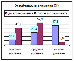 Рисунок 4 – Концентрация и устойчивость внимания испытуемых до и после эксперимента (данные даны количества учащихся в %.)Проведенный сравнительный анализ переключения внимания и уровня внимания так же показал положительные результаты. Так, переключение внимания у старшеклассников повысилось с 0,47 до 0,59. Соответственно повысился и уровень внимания в целом, о чем свидетельствуют полученные коэффициенты до эксперимента было 2,98 после эксперимента стало 3,66. Результаты сравнительного анализа представлены в динамике на Рисунке 5.